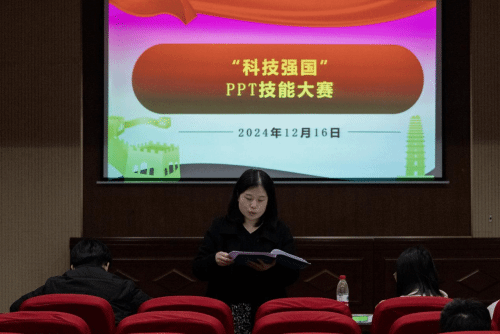 为了激发青年学子的创造力,提升学生PPT制作能力,2024年12月16日,软件学院在9-115报告厅举办以“科技兴国”为主题的PPT大赛决赛。软件学院团委书记苏芳芳老师、团委副书记樊宝珠老师、2023级辅导员郭佳妮老师、2024级辅导员王亚魁老师以及2023级、2024级部分学生参加。